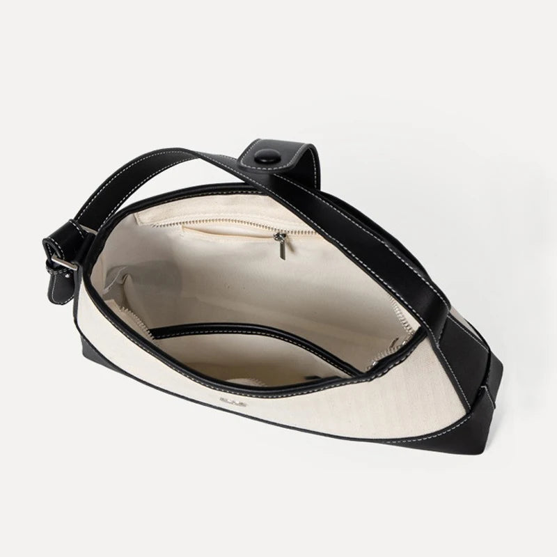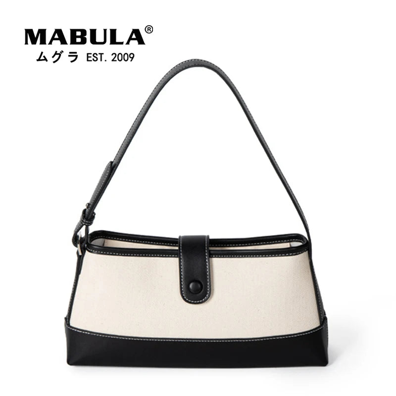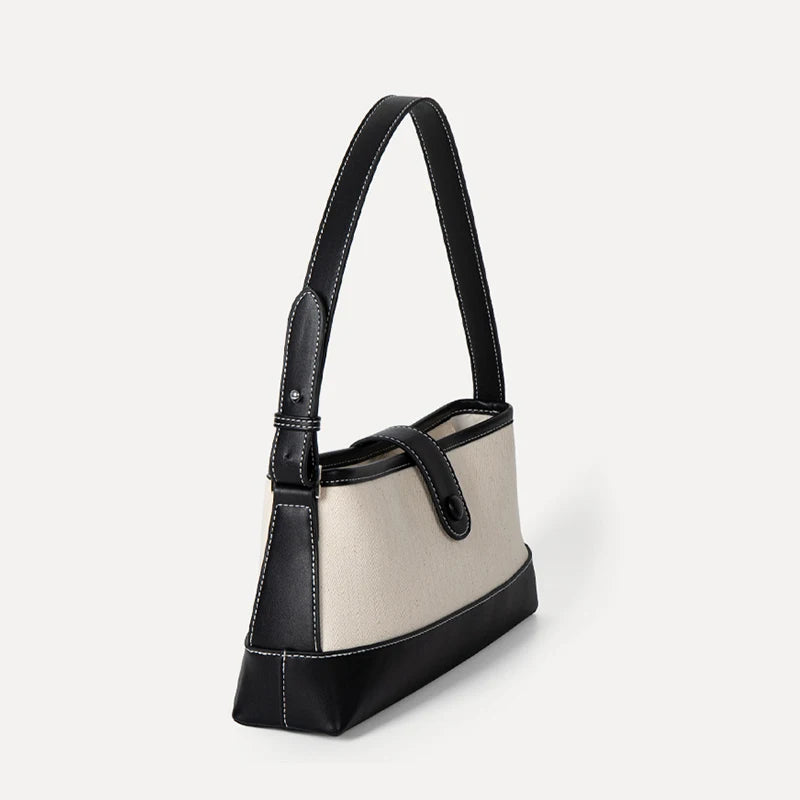 This casual canvas handbag is perfect for everyday use. It features a stylish leather patchwork design and can be worn as an underarm or shoulder bag.