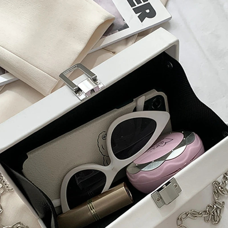 This creative box messenger bag is a fun and stylish accessory for women. Made of high-quality PU leather, it features a unique cartoon design that adds a touch of personality to any outfit.
