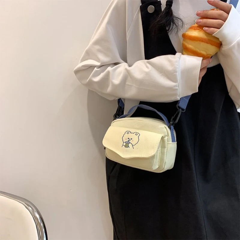 This adorable LongKeeper Canvas Shoulder Bag features a cute bear print, perfect for girls. It is small and convenient for carrying your phone and essentials.