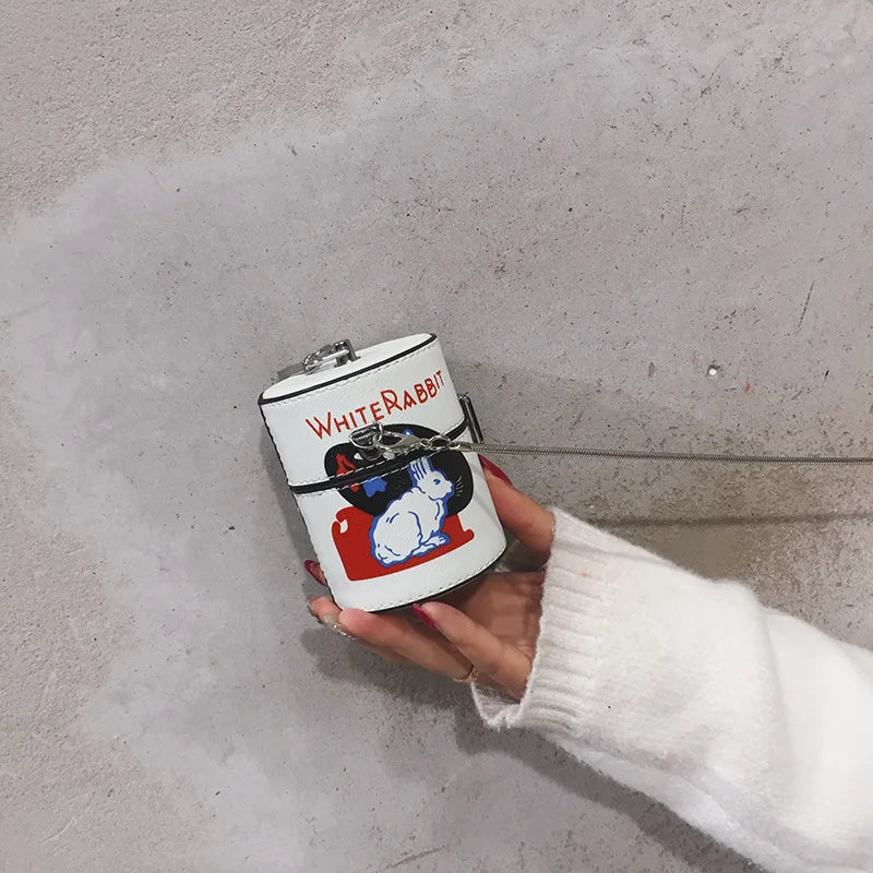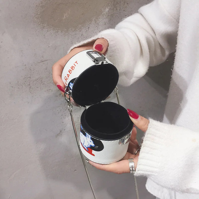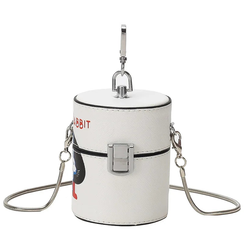 This mini cylinder-shaped bag features a cute cartoon rabbit print, made of high-quality PU material. It has a bucket design with a chain strap, perfect for casual or daily use.