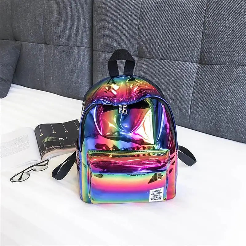 This stylish backpack is perfect for teenage girls with its holographic silver PVC material. It's great for school, casual outings, or as a fashion statement.