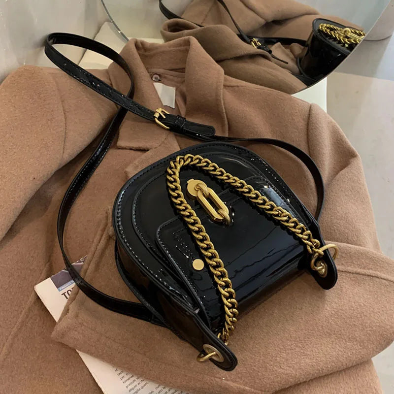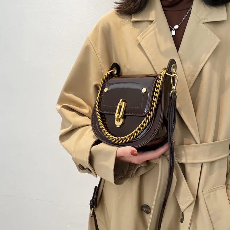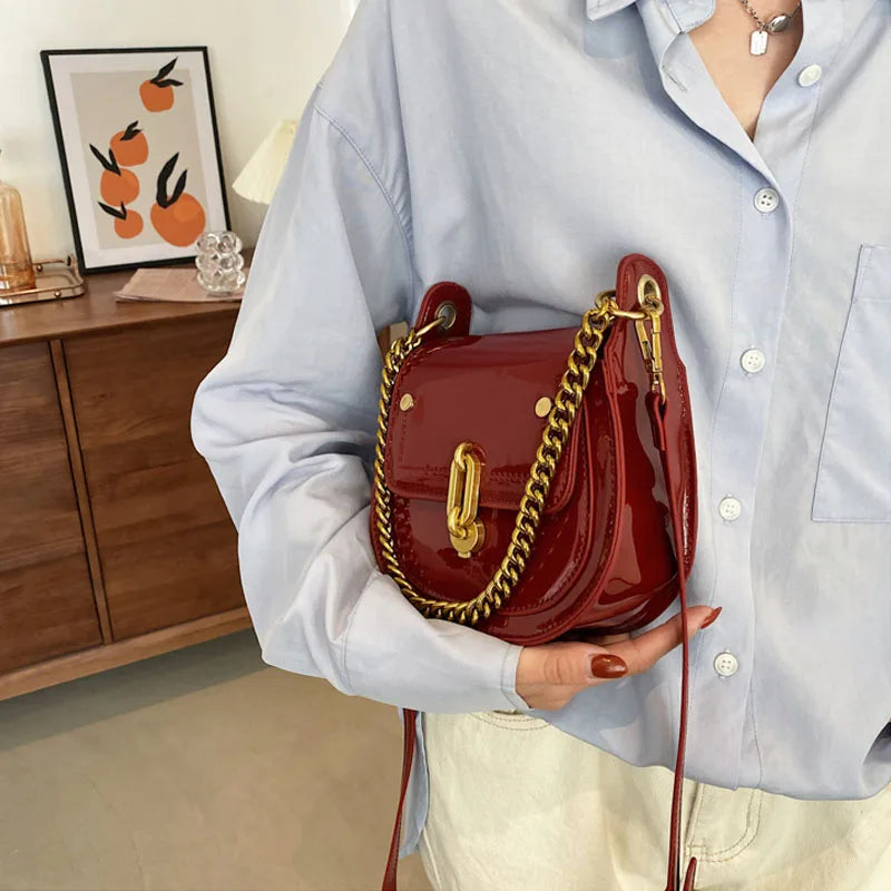 Casual Saddle Bag Metal Chain Handbag Bright Patent Leather