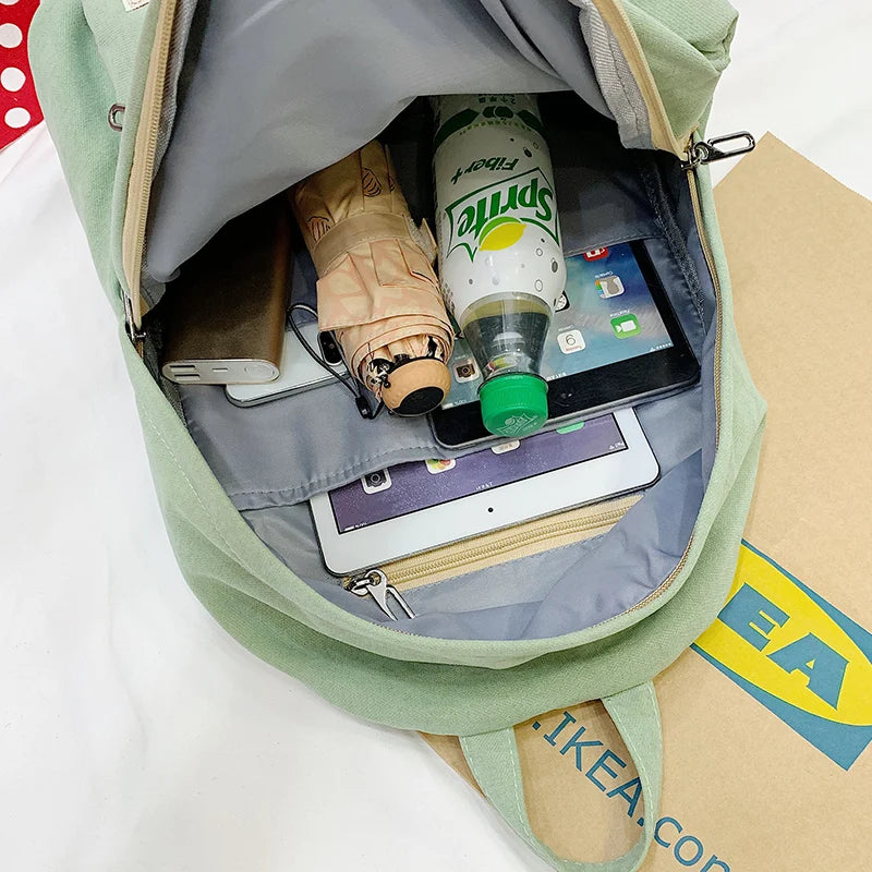 This casual backpack is made of durable canvas material, perfect for women students. It features solid appliques and a preppy style design.