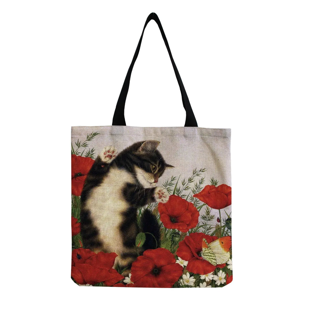 Cat Flower Painting Print Tote Bag Women Handbag Large Shoulder Bag