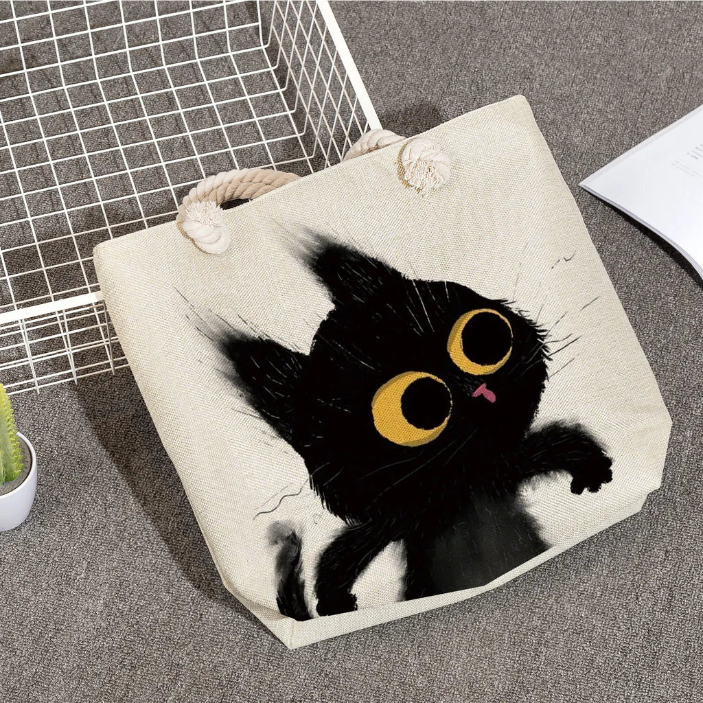 Cat Print Handbags Linen Thick Rope Women Tote Bag High Capacity