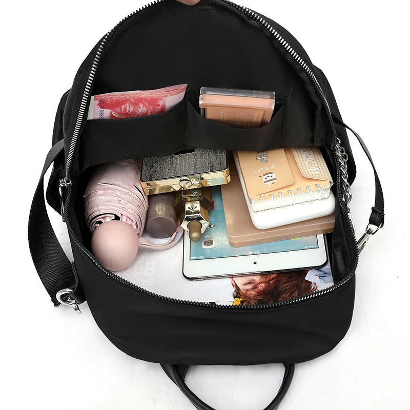 Stay stylish and organized with this chic chain decorative backpack made of high-quality nylon cloth. This multi-functional bag offers a large capacity for all your essentials.