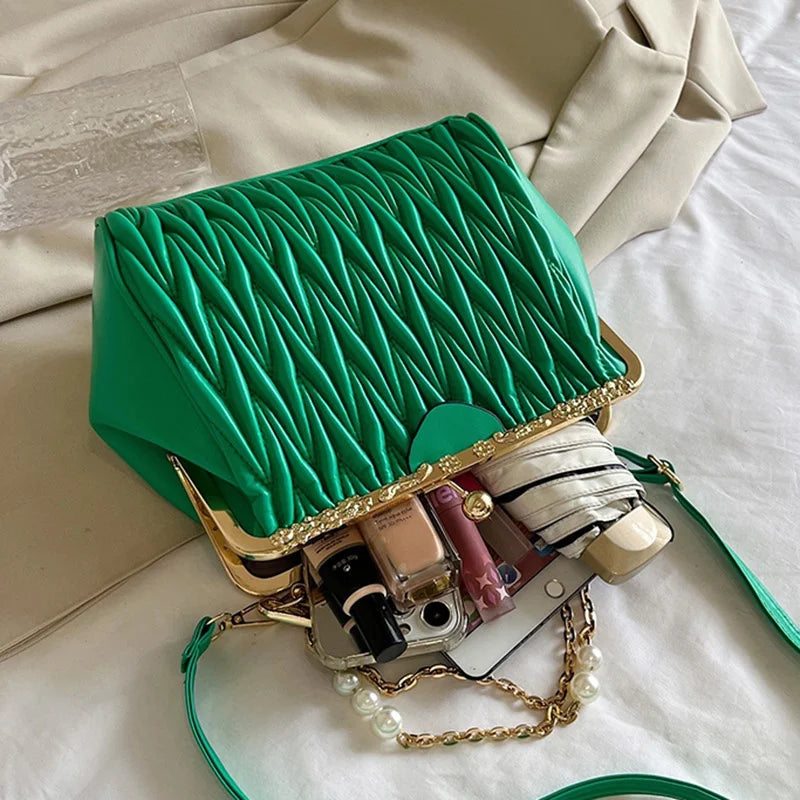 Elegant and versatile crossbody bag with a chain strap and kiss lock closure.