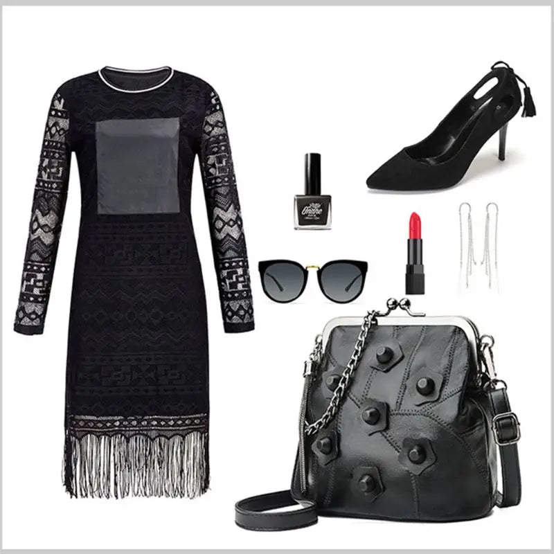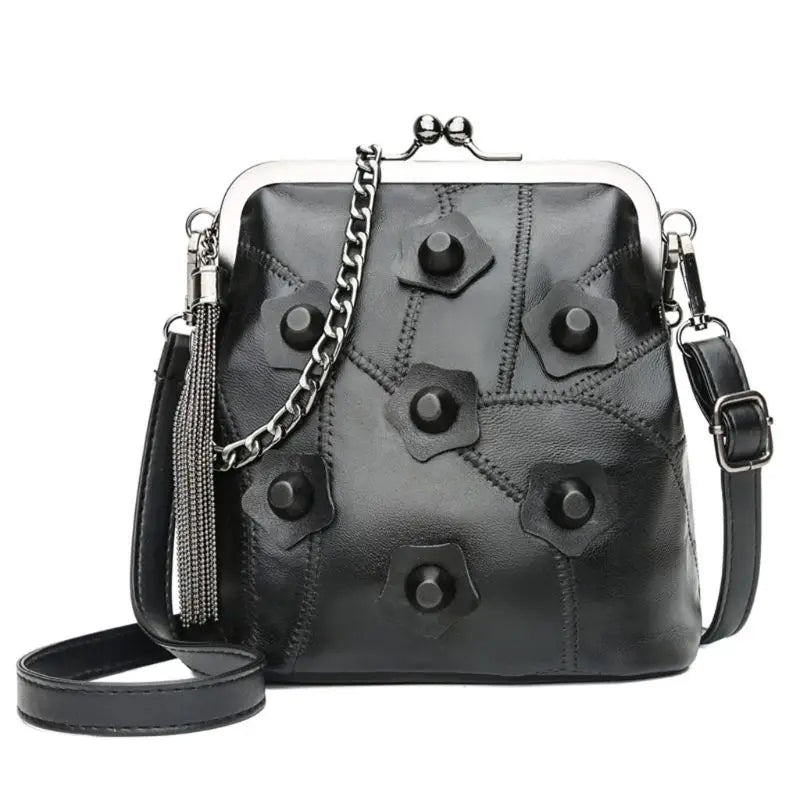 This stylish shoulder bag is made of high-quality sheepskin material with rivet and tassel accents, perfect for casual use or special occasions.