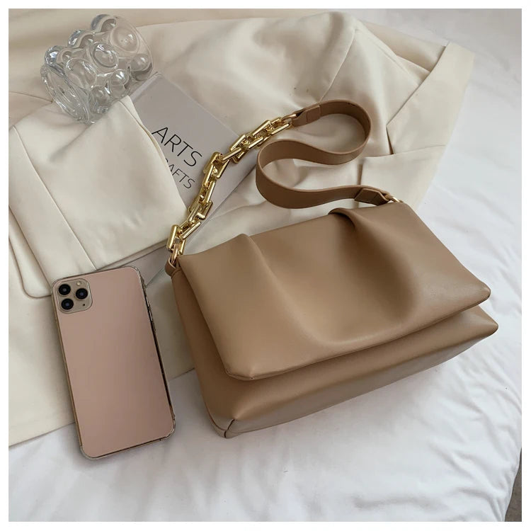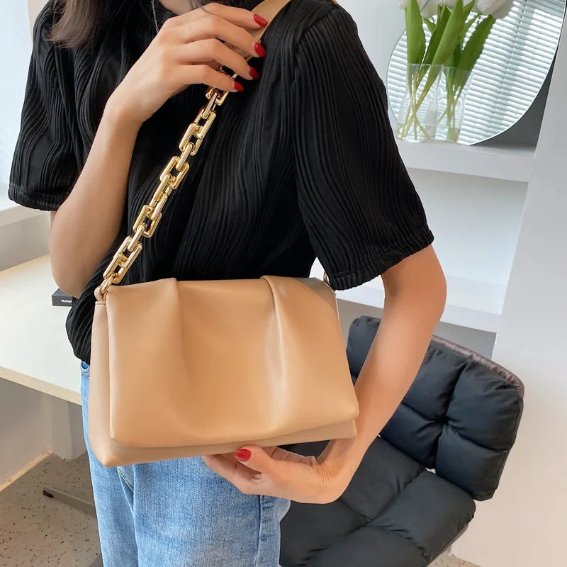 Stay on trend with this stylish shoulder bag made of high-quality Pu leather. The small size and acrylic details make it a unique and eye-catching accessory. The fold flap design adds a modern touch to your outfit.