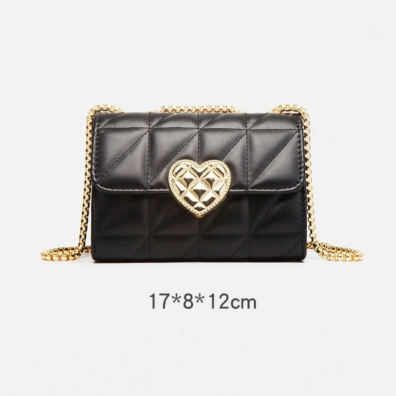 This classic quilted bag is the perfect blend of style and function. It features a heart-shaped hasp for added charm and a chain strap for versatile wear as a shoulder or crossbody bag.