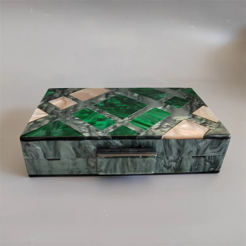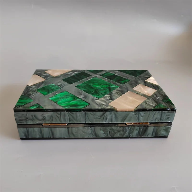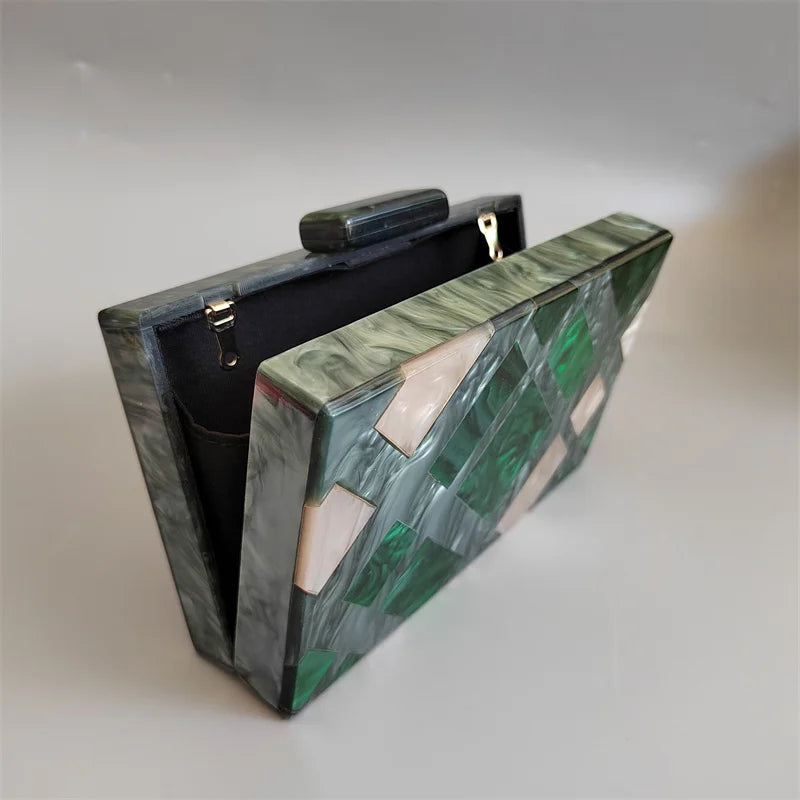 This acrylic women's bag features a unique geometric design in a beautiful champagne color, perfect for evening events. It can be worn as a clutch or with the chain strap as a shoulder bag. Ideal for ladies and girls, it is a stylish accessory that adds elegance to any outfit.