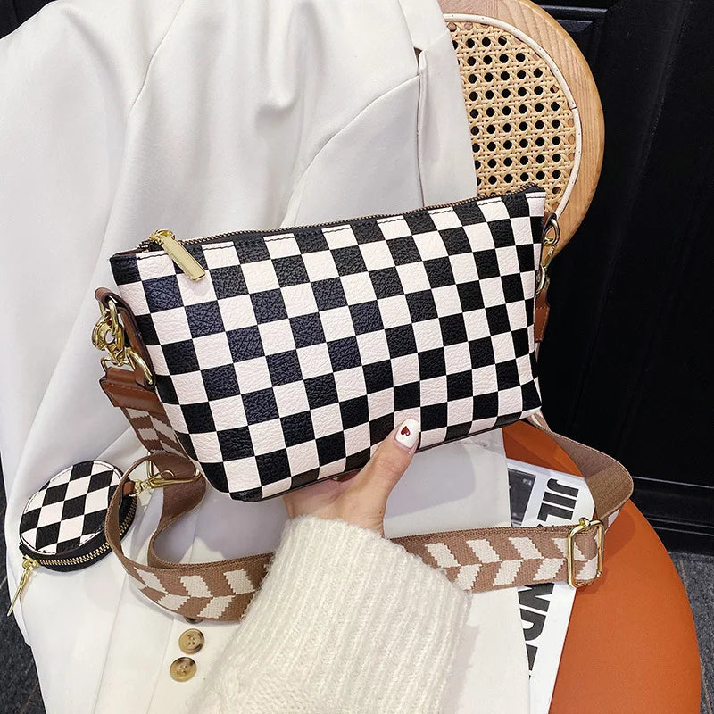 Stay stylish with this 2-piece bag set featuring a trendy checkerboard design. Made of high-quality PU leather, the set includes a shoulder bag with a wide strap and a chain crossbody bag. Complete your look with the matching wallet.