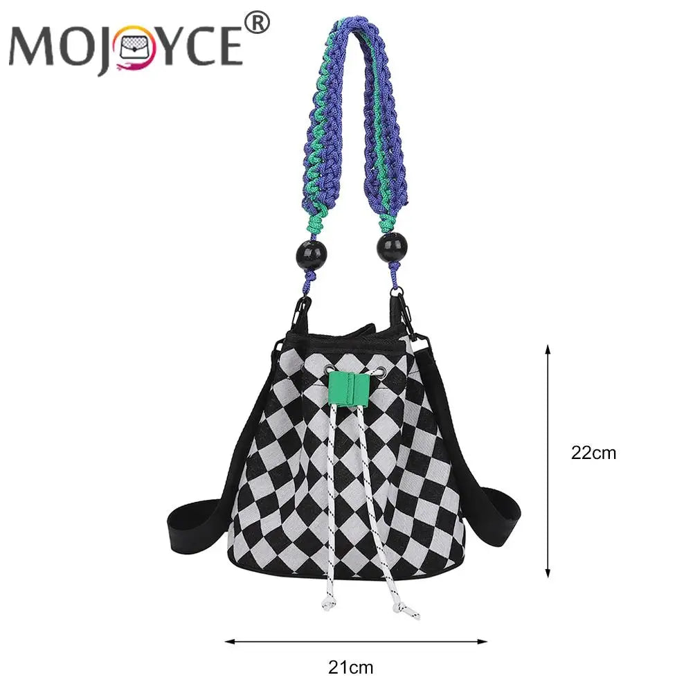 Stay trendy with this retro checkered pattern shoulder crossbody bag. It features a drawstring closure and a woven handle for a unique look.