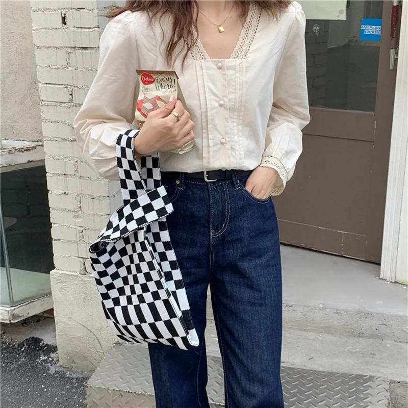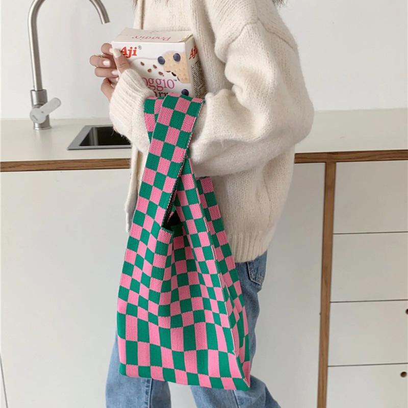Checkered Tote Shoulder Bags Retro Weave Plaid Handbags Contrast Striped
