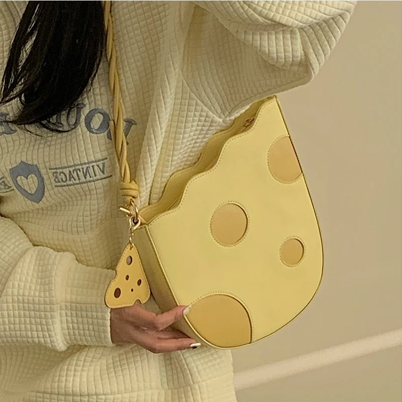 This lovely cheese-shaped shoulder bag in yellow PU leather is the perfect accessory for women. It is ideal for girls and features a high-quality design.
