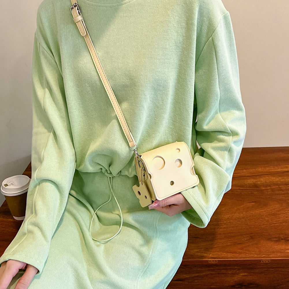 This adorable mini bag is shaped like a slice of cheese and is perfect for holding small items like earphones, lipstick, or other essentials. It features a square slice pendant and can be worn as a crossbody bag.