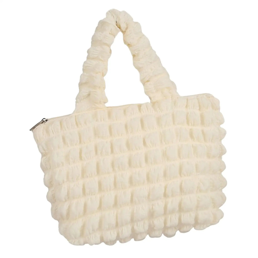 This stylish handbag is made of bubble chiffon polyester material, perfect for shopping, parties, or daily use. It features a large capacity and a secure zipper closure.