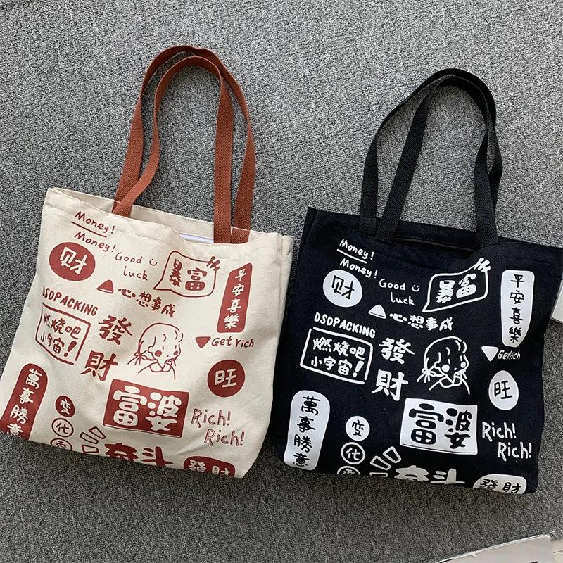 Chinese Rich Women Cartoon Print Canvas Shoulder Bag Book Handbags