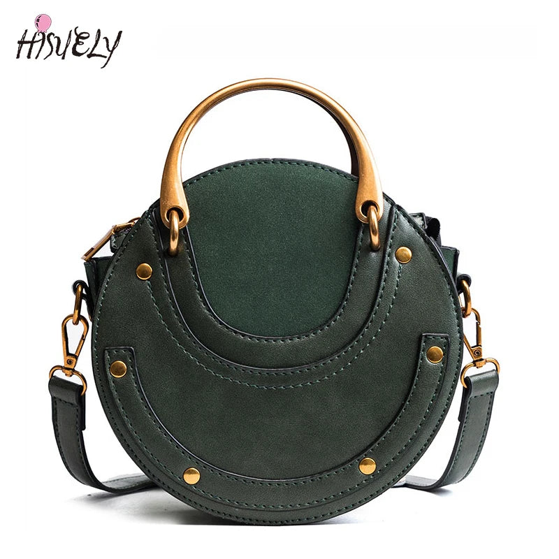 This circular women handbag is made of high-quality leather with rivet accents. It features a round ring design and is perfect for daily use.
