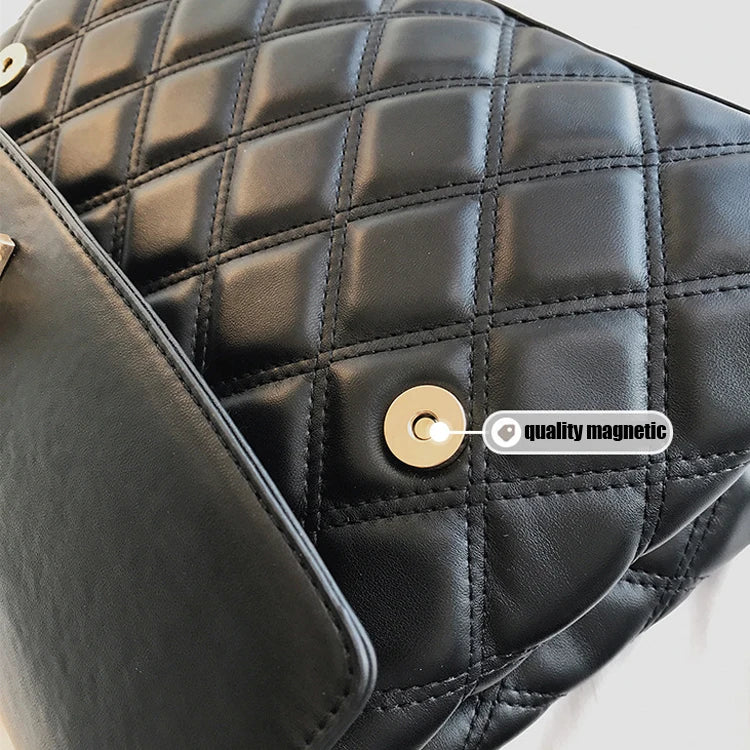 This elegant tote bag features a diamond lattice design with chain cross detailing. The large size makes it perfect for carrying all your essentials in style.