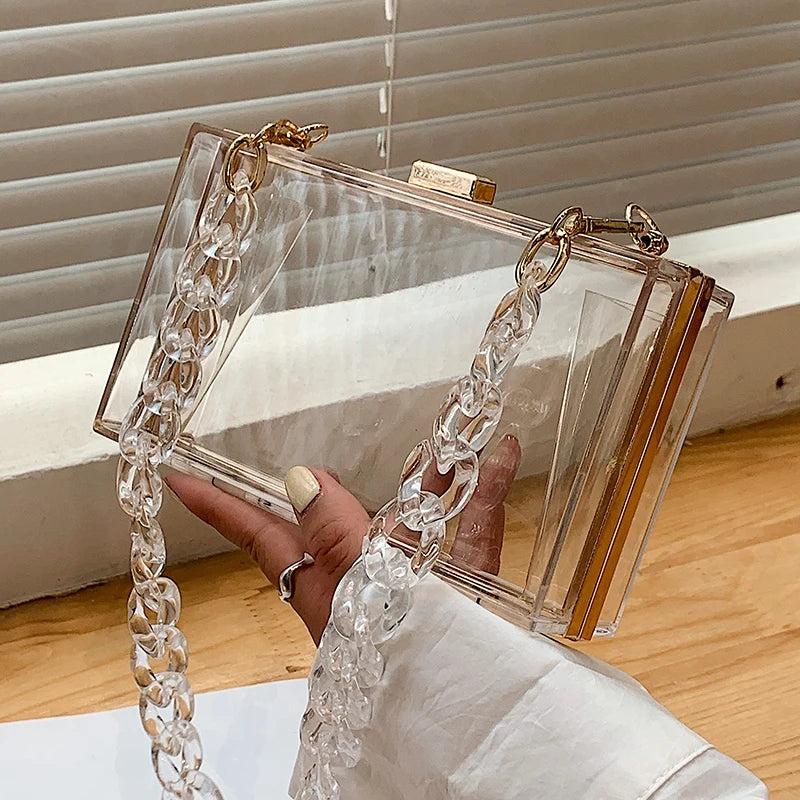 Elevate your style with this trendy transparent box bag that features a chic design and a convenient shoulder chain. Perfect for adding a modern touch to any outfit.