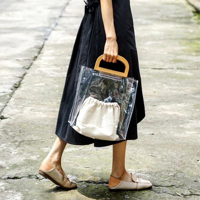 Clear PVC Handbag Women Beach Bag Wooden Handle Tote Handbags
