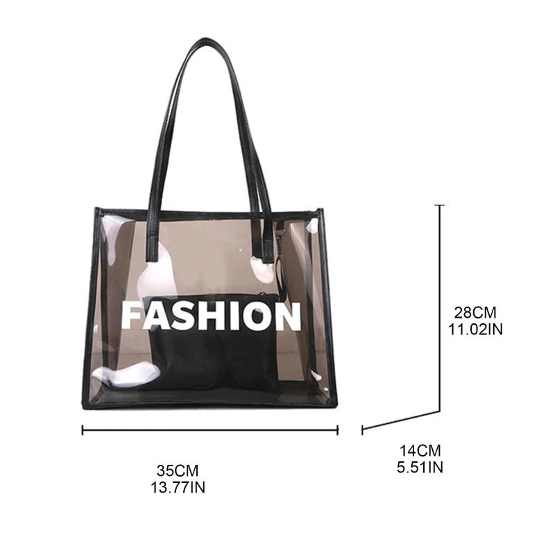 This stylish clear PVC jelly bag is perfect for summer. It features a spacious design and a comfortable shoulder strap.