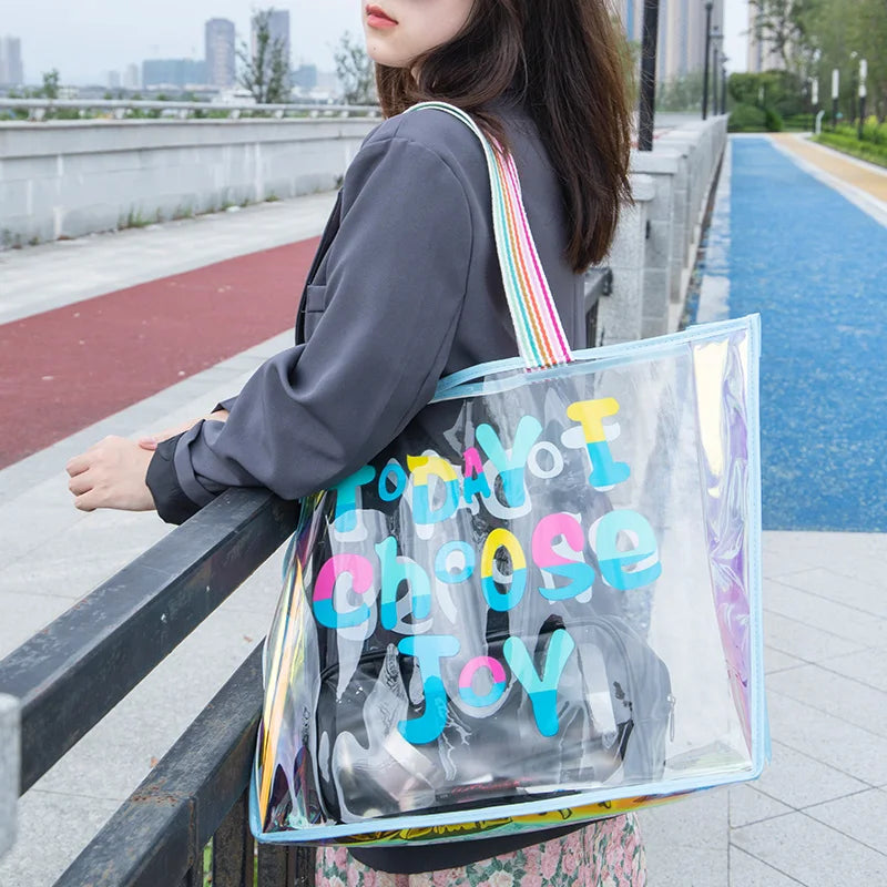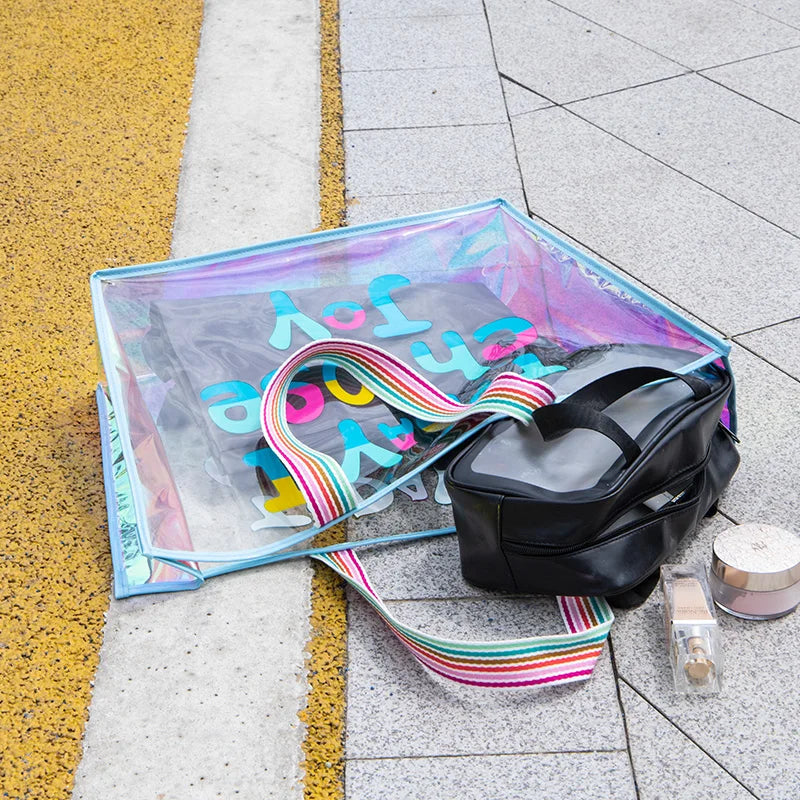This clear PVC laser tote bag is perfect for summer outings with its large capacity, waterproof design, and stylish appearance. Ideal for shopping, gifts, or everyday use.