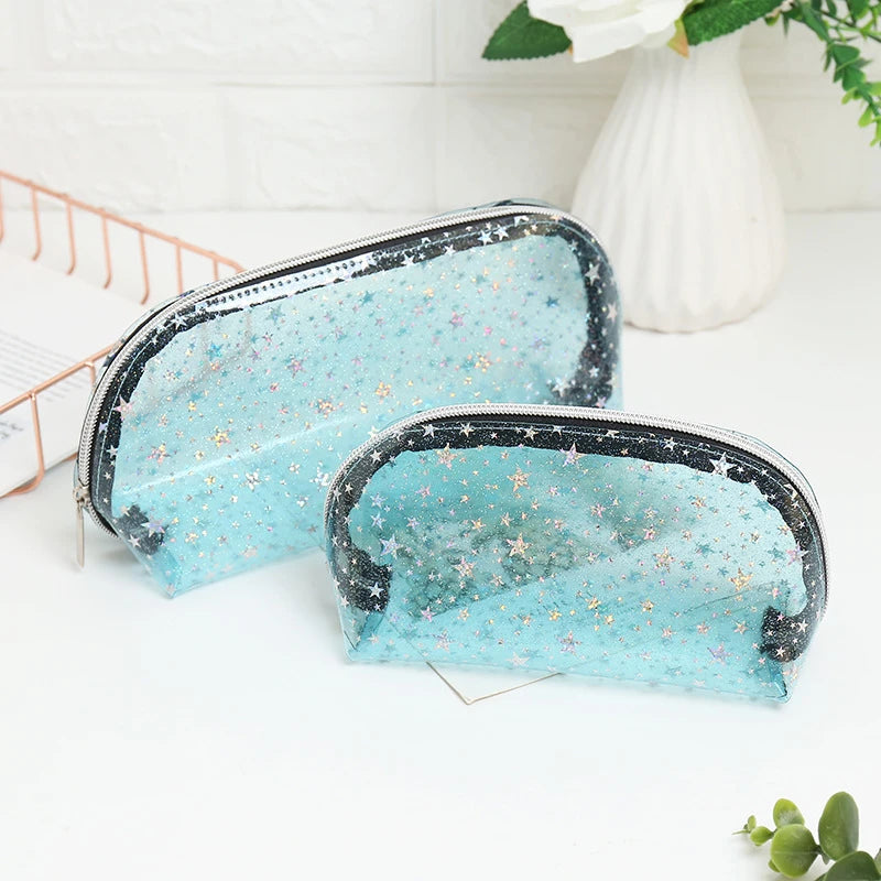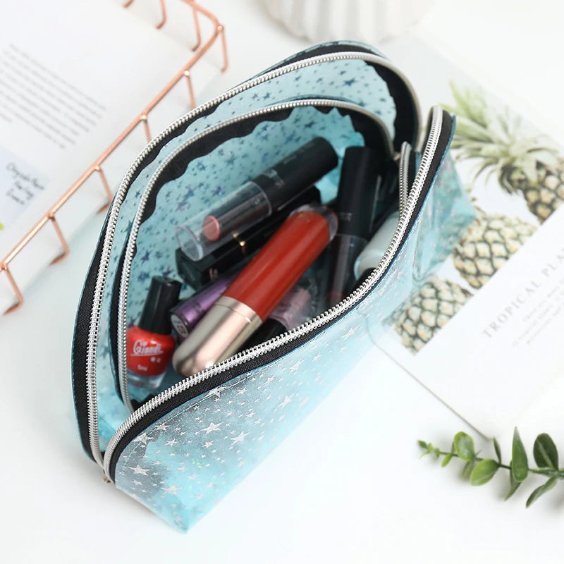 This transparent makeup case is perfect for organizing your cosmetics. It's ideal for travel and features a star design. Keep your makeup essentials at hand with this stylish bag.