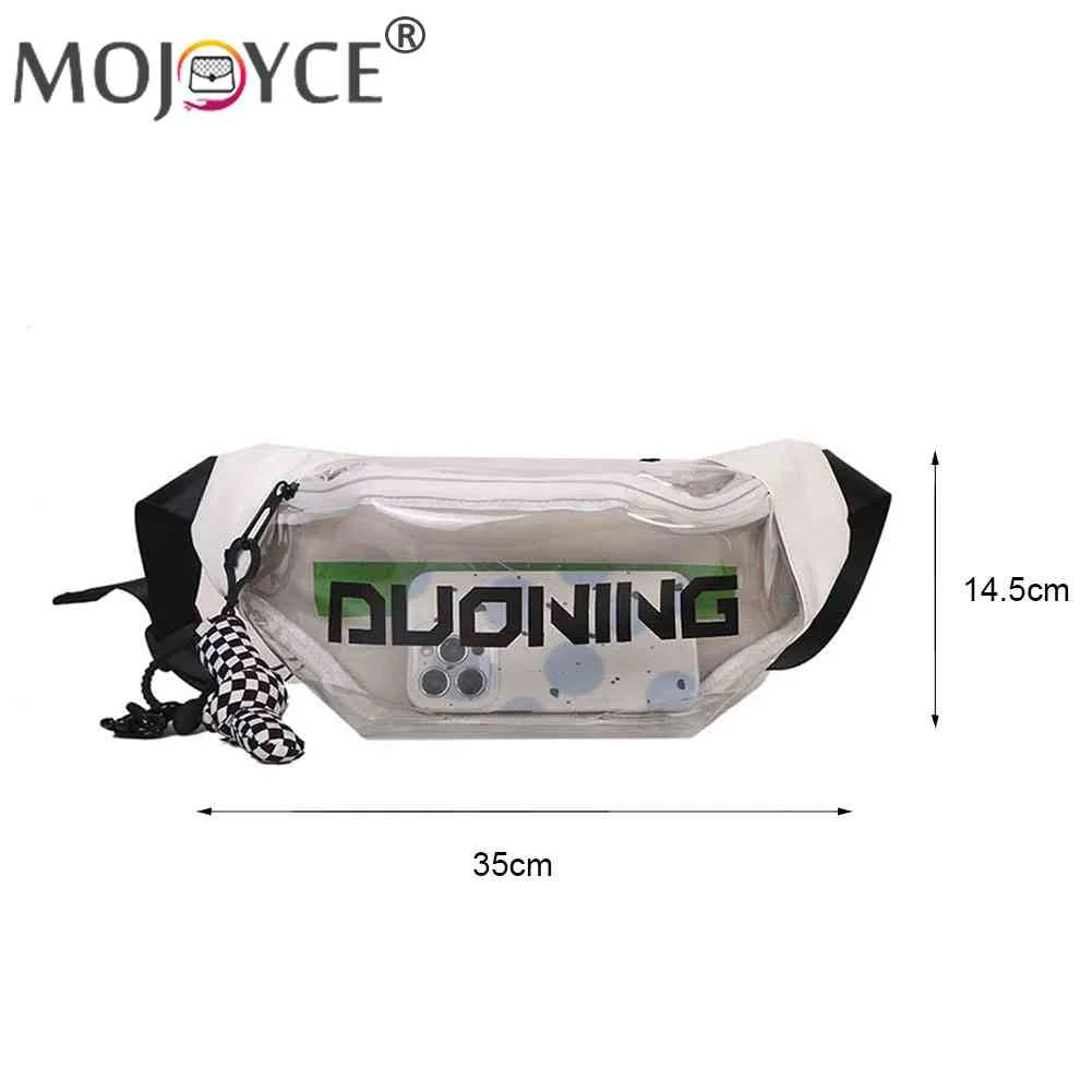 This waist bag is a multi-functional clear PVC belt purse featuring a letter printed design with pendant. It has an adjustable buckle strap suitable for both women and men.