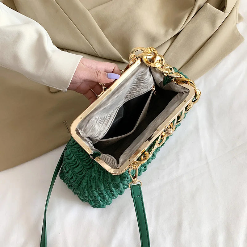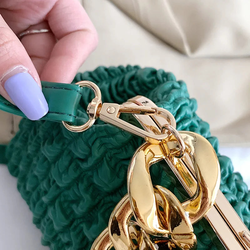This women's bag is perfect for casual outings with its pleated leather design. It features a chain shoulder strap and clip closure. The bag is a versatile accessory that can be used as a crossbody or tote.