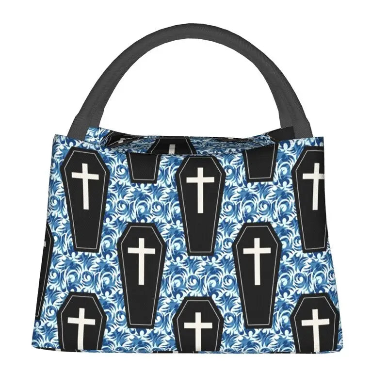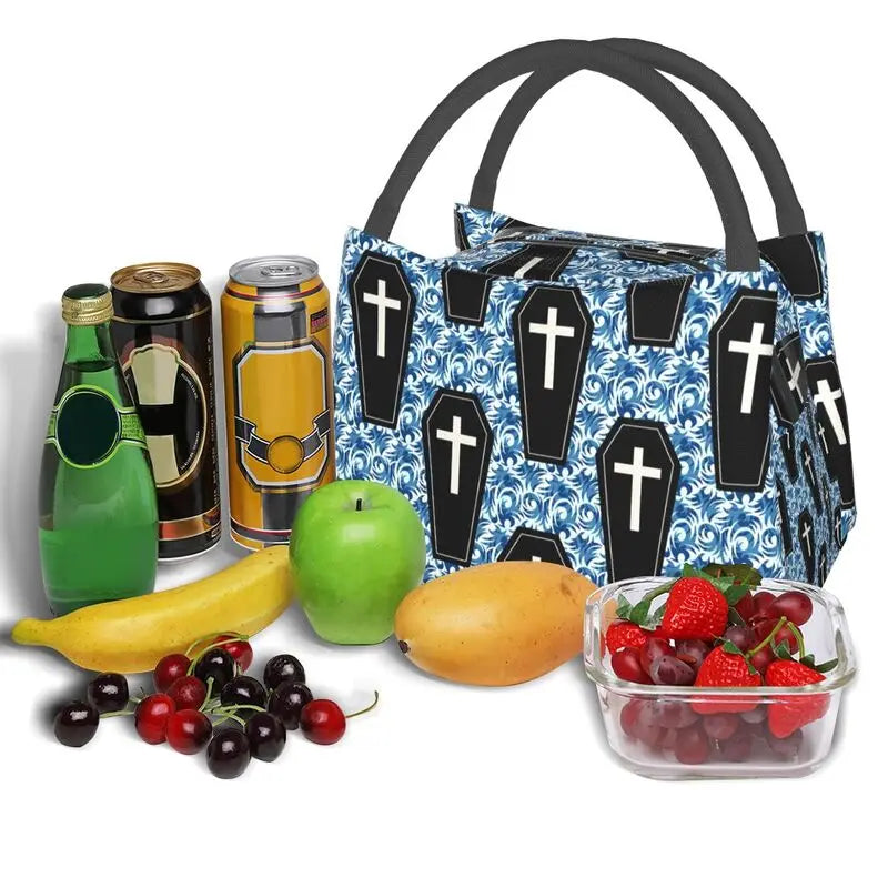 Stay cool and stylish with this leakproof thermal cooler bento box lunch bag featuring a coffin pattern design inspired by Halloween and Autumn themes.
