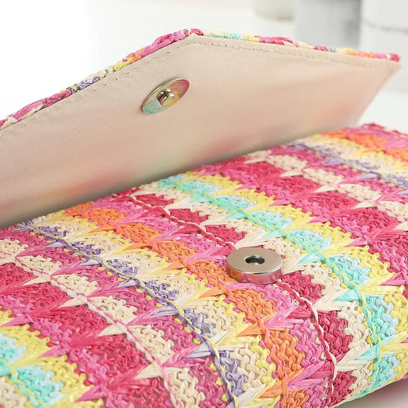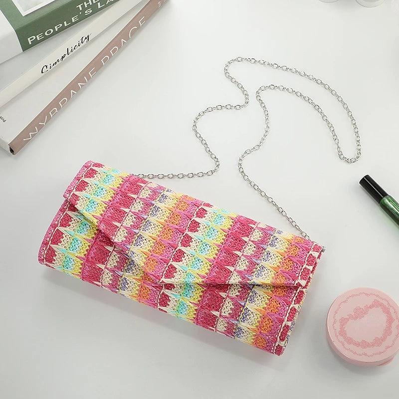 Elegant and stylish women evening shoulder bag perfect for parties and special occasions. Features a colorful design with a sliver chain messenger bag.