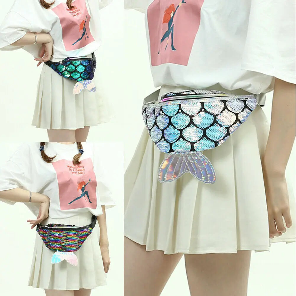 Stay stylish with this hot women's fanny pack adorned with colorful laser sequin mermaid fish tail design. Perfect for carrying small essentials, this waist bag can also be used as a chest pouch or shoulder belt bag.