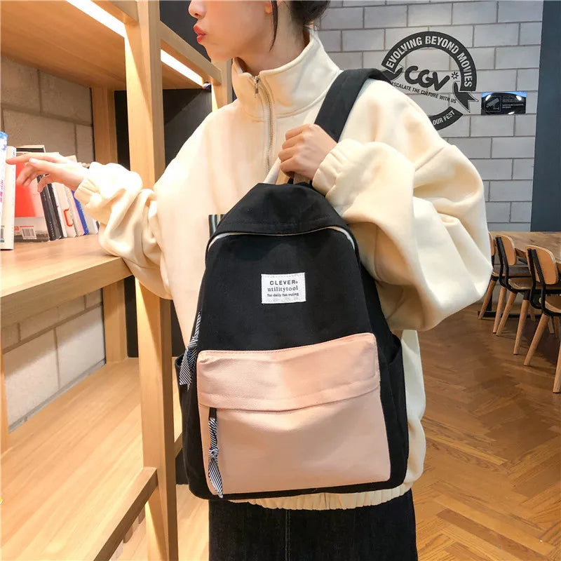 Colorful Stitching Canvas Backpack for Women and Girls