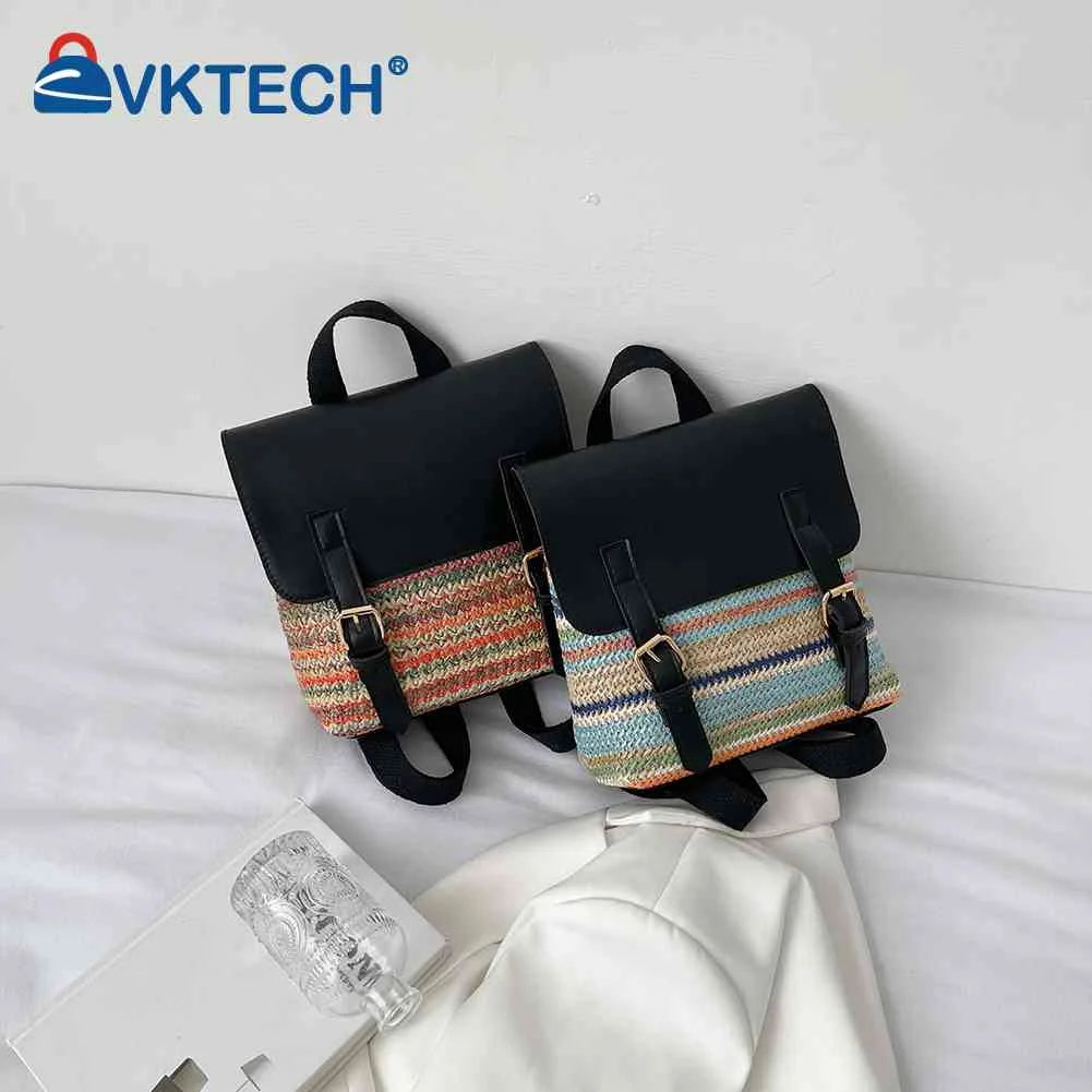 Colorful Straw Backpack for Women PU Leather Splicing School Bag Travel Beach