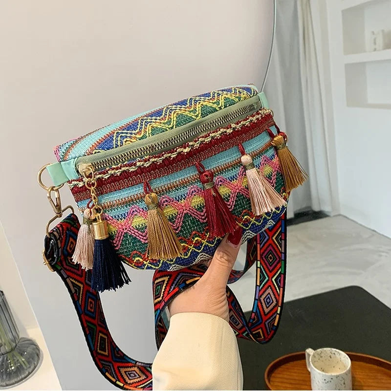Description:This National Tassel Weaving Waist Bag is designed for women who appreciate vibrant colors and stylish designs. The canvas material is durable and the wavy stripe pattern adds a fun touch to your outfit. It can be worn as a waist pack or a crossbody bag, making it versatile for...