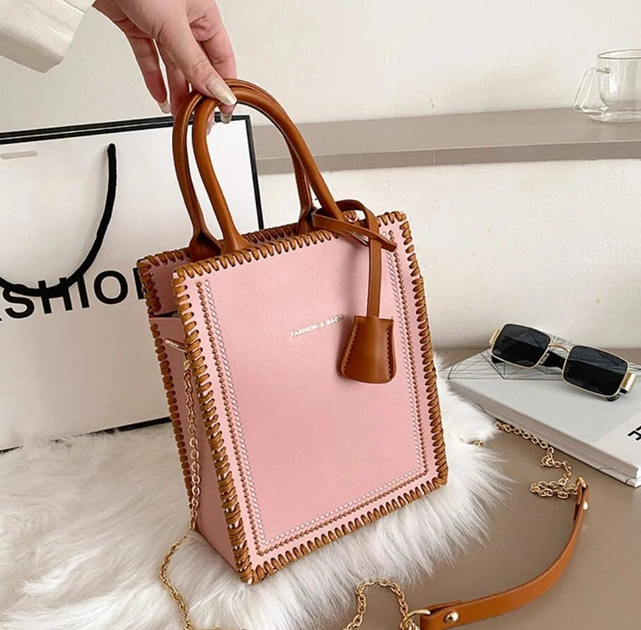 This tote bag is crafted from premium PU leather with a stylish contrast design. It can be used as a shoulder bag, messenger bag, and phone purse.
