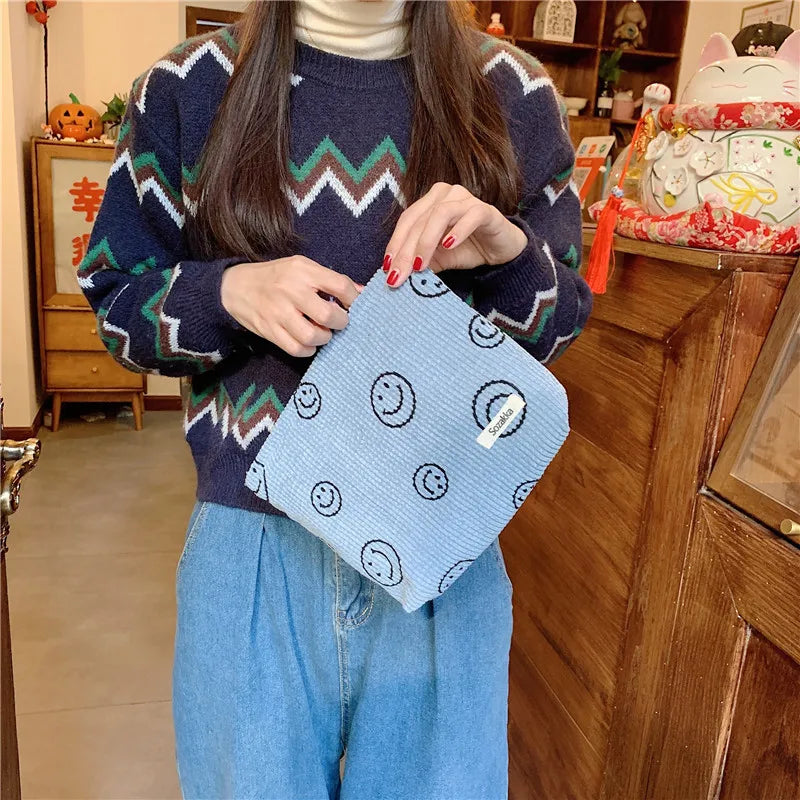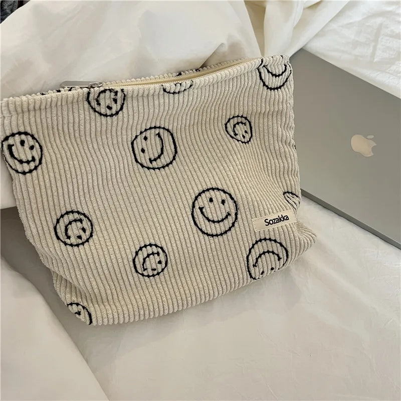 This corduroy cosmetic bag is perfect for storing makeup, pencils, or other small items. It features a cheerful smile and dots design, making it a stylish accessory for any woman.