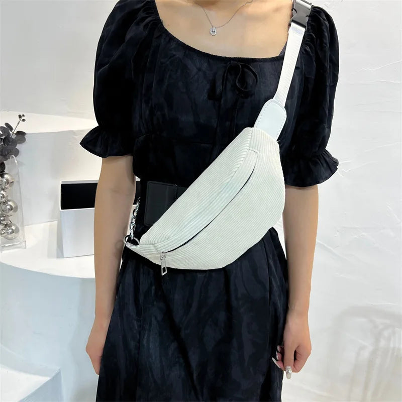This waist bag is made of high-quality corduroy material, perfect for women on the go. It can be worn as a fanny pack, chest bag, or crossbody bag.