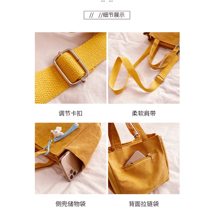 This large-capacity handbag is perfect for casual outings and can be used as a messenger bag. Made of durable canvas, featuring a cute corduroy mini doll design.
