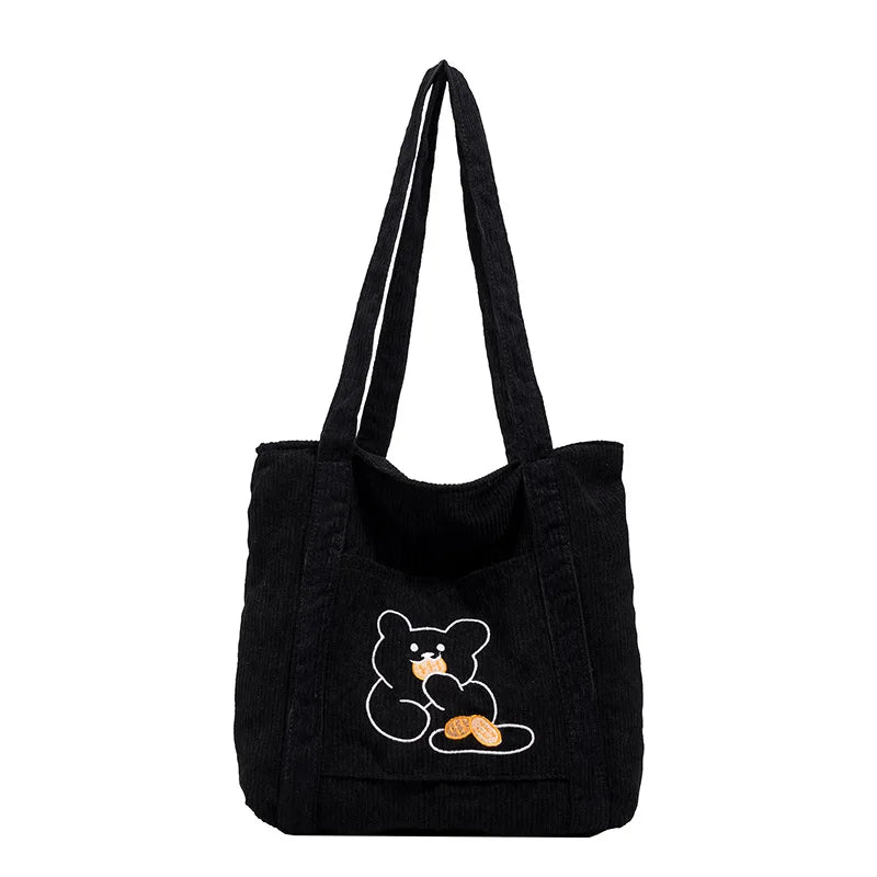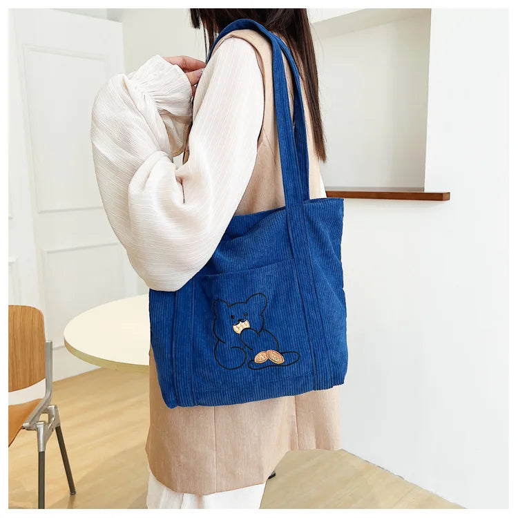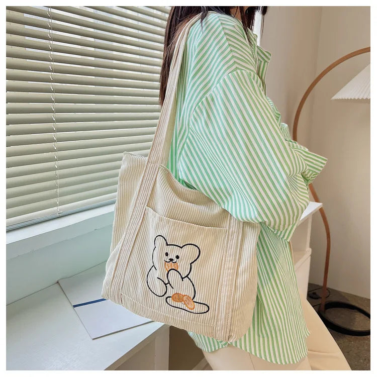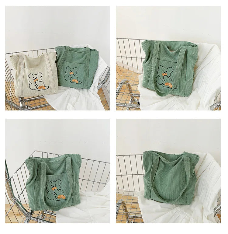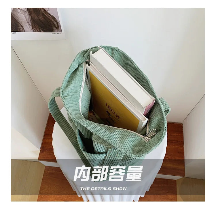 This women's corduroy shopping bag is made of canvas cloth, featuring a convenient outside pocket. It is a fashionable and practical choice for daily use.
