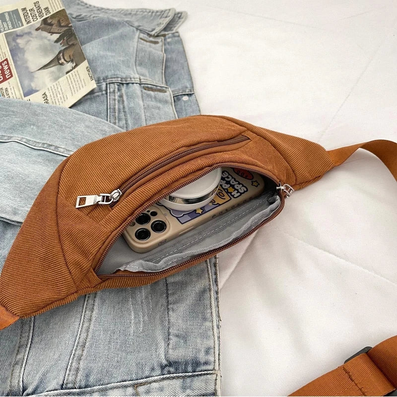 This stylish corduroy fanny pack is perfect for girls, ladies, and women. It features a zippered pouch to securely hold your phone and other essentials while on the go.