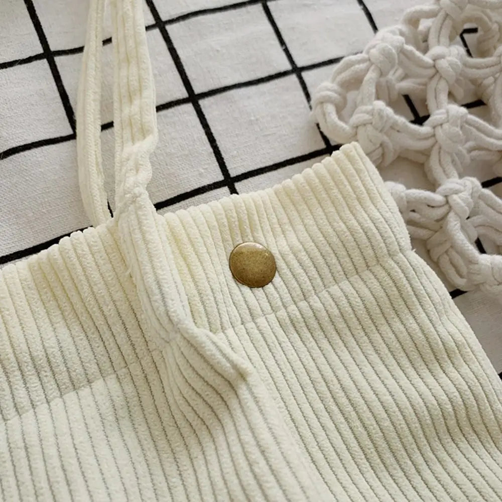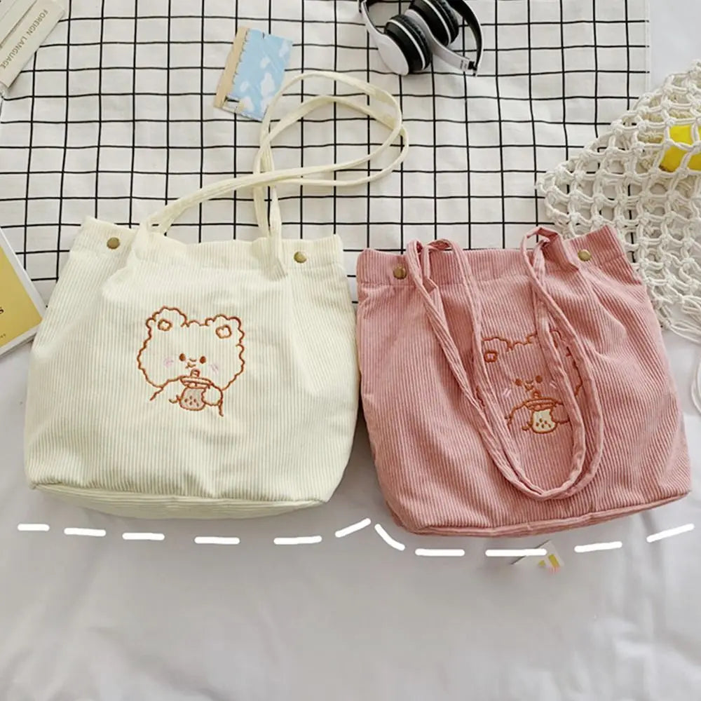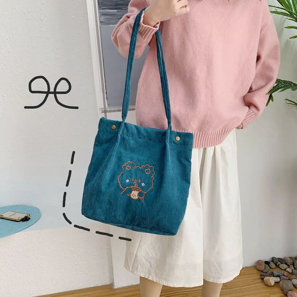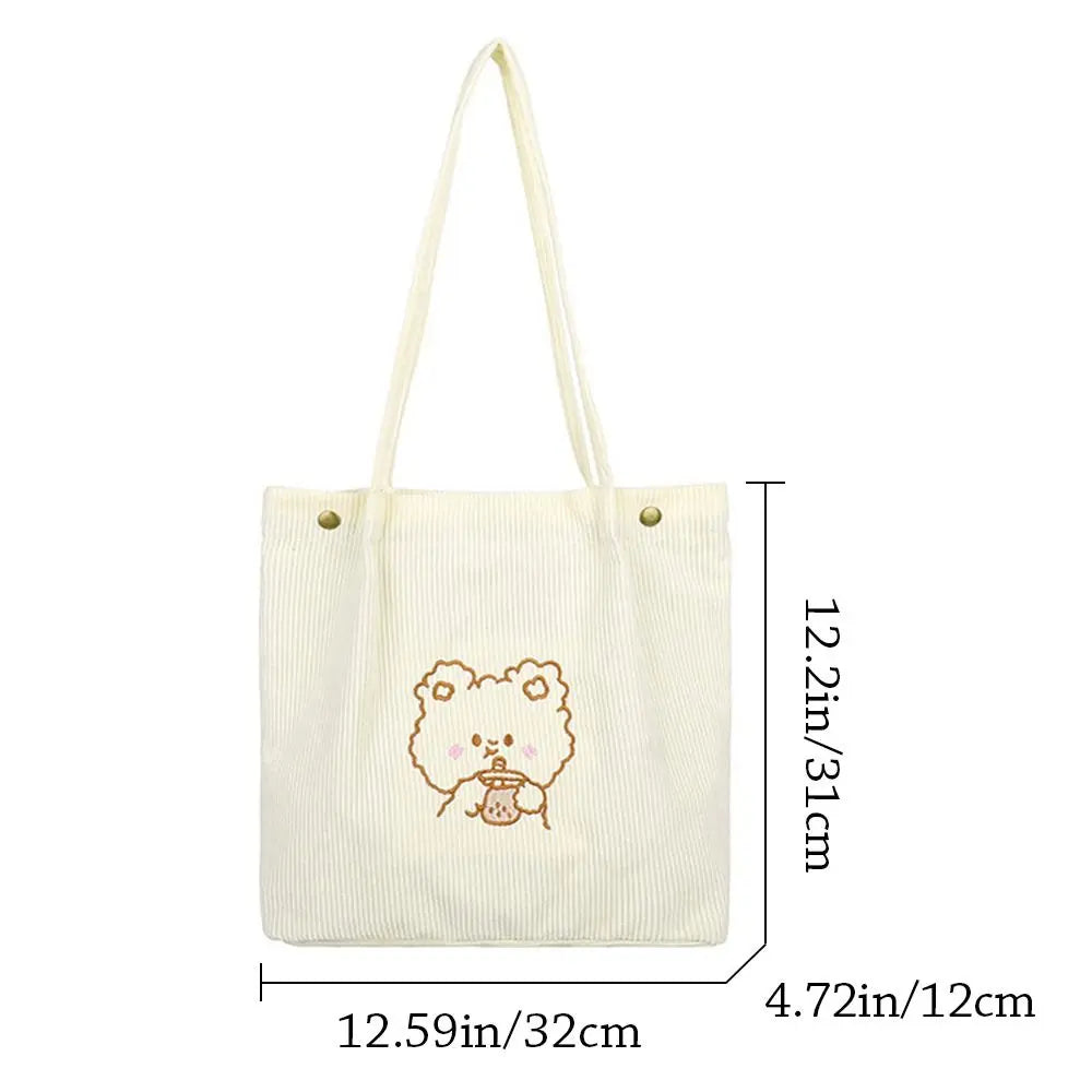 This cute Corduroy Tote Bag features an embroidered bear design perfect for students and women. Ideal for shopping trips and everyday use.