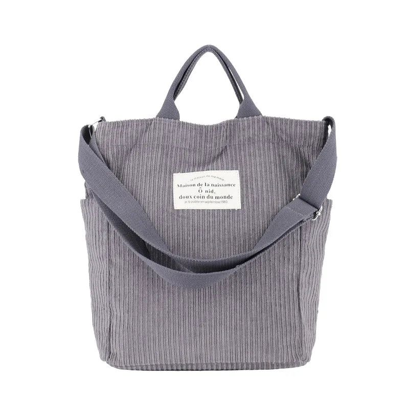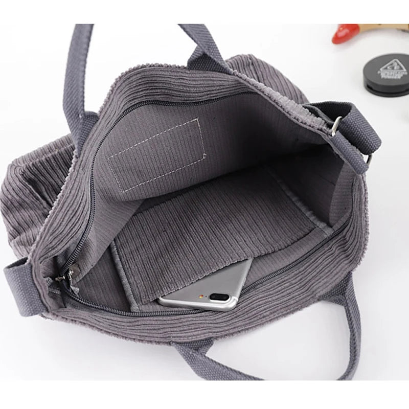 Stay stylish and organized with this corduroy tote handbag. Ideal for work or casual outings, it offers a spacious interior and a crossbody strap for added convenience.