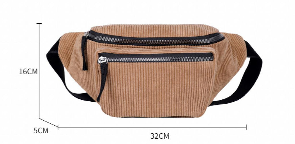 This women's corduroy waist bag is a stylish and functional accessory with a zipper closure. Perfect for keeping your essentials close at hand.
