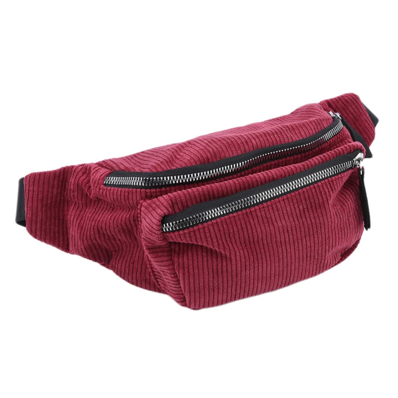 This waist bag is perfect for women on the go. It is made of corduroy and features a zipper closure. Ideal for carrying your phone and essentials during outdoor activities or travel.