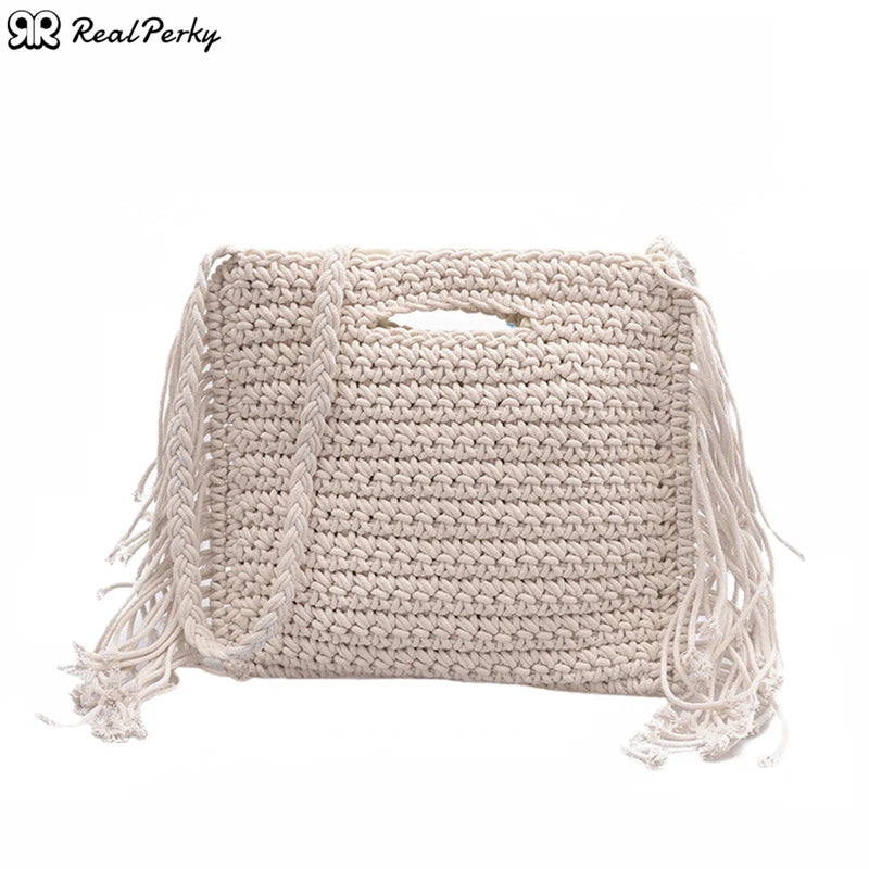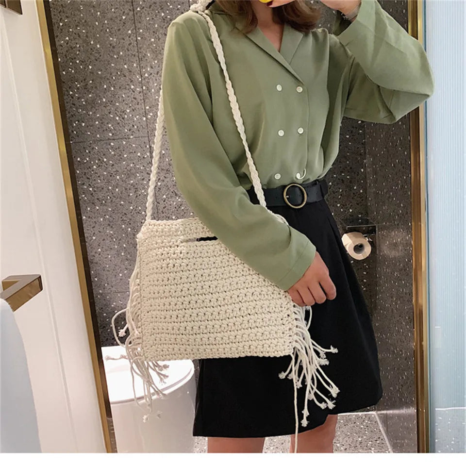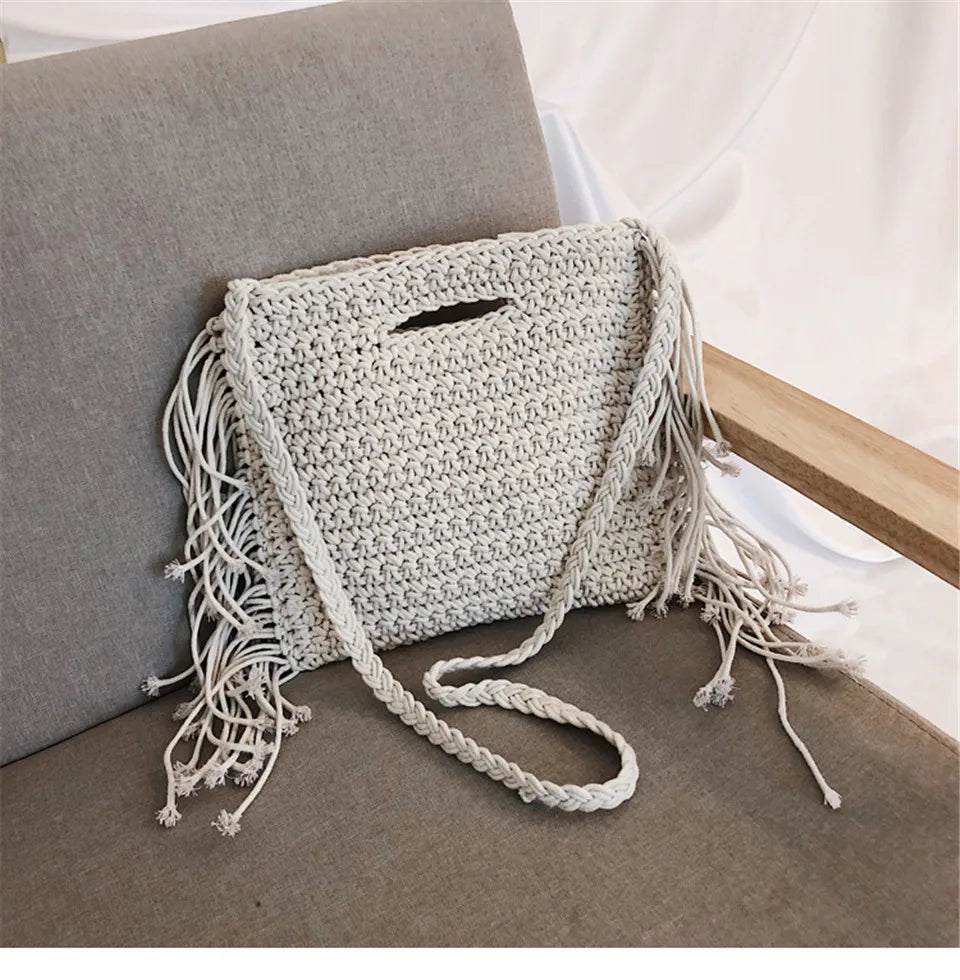 Elevate your holiday look with this hand-held fringed beach straw bag. Made of high-quality cotton, it's perfect for a day at the beach or a casual outing.