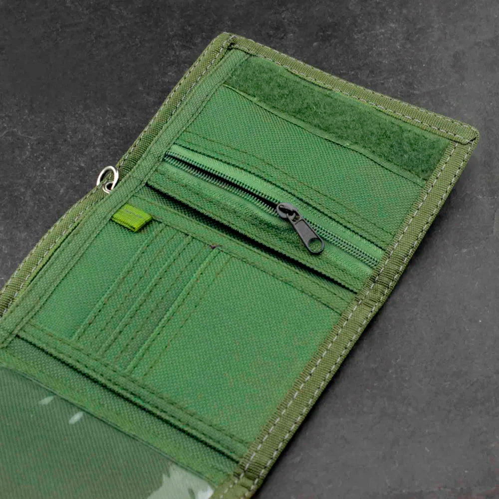 Keep your money and cards secure with this trifold wallet featuring a military camouflage design. The wallet comes with an anti-theft chain for added protection.
