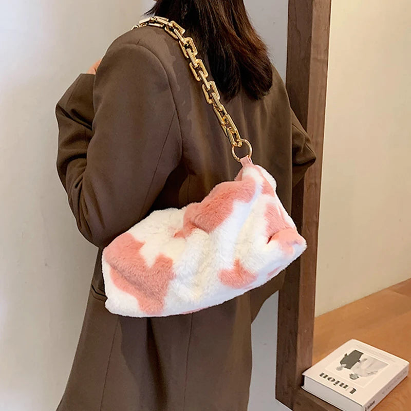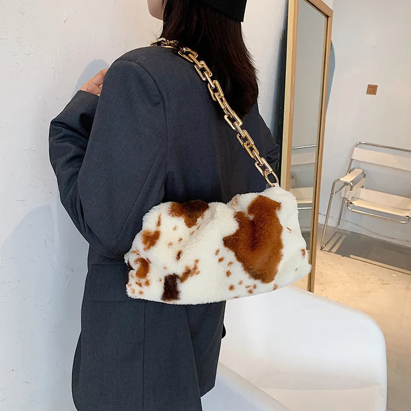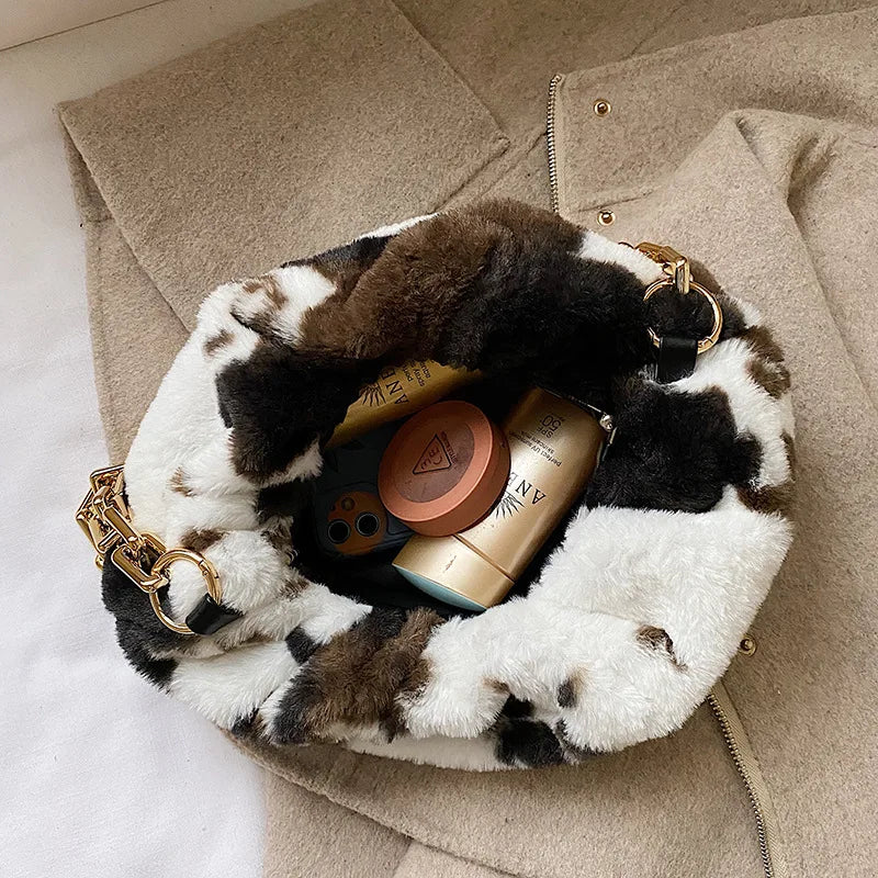 Cow Pattern Plush Shoulder Bag Winter Zipper Handbag for Women